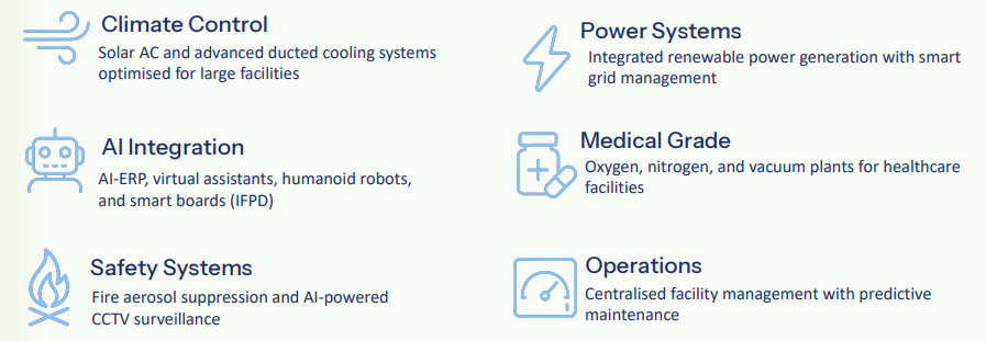 We delivers complete smart institutional ecosystems for universities, hospitals, corporate campuses, shopping centres, and smart city developments. This vertical generates large-ticket EPC revenue with recurring AMC and SaaS income streams.